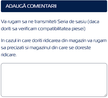 Această opțiune poate fi aleasă prin selectarea căsuței RIDICARE DIN MAGAZIN, de la DATE LIVRARE, iar magazinul dorit poate fi adăugat manual în rubrica ADAUGĂ COMENTARII.